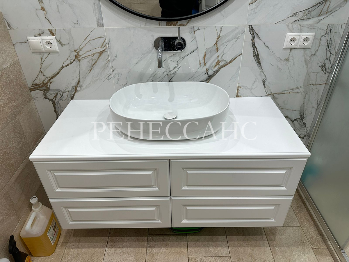 Подвесная тумба в классическом стиле с белыми фасадами, украшенными фрезеровкой. Четыре выдвижных ящика с рамочными элементами обеспечивают просторное хранение. Белая столешница из искусственного камня дополнена элегантной накладной раковиной овальной формы.