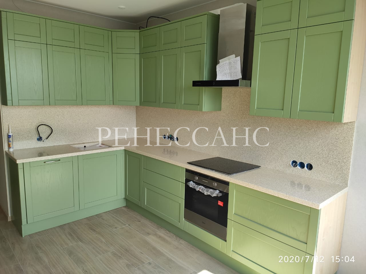 Угловая кухня в свежем фисташковом оттенке с классической фрезеровкой на фасадах и столешницей под светлый мелкозернистый камень. Верхние навесные шкафы выполнены с фрезерованными фасадами и распашными дверцами с хромированными ручками. Гарнитур включает высокий модуль со встроенной декоративной вытяжкой черного цвета, которая служит визуальным акцентом в композиции. Нижние модули оснащены выдвижными ящиками, распашными дверцами и системами хранения. Столешница светлого оттенка под мелкозернистую структуру гармонично дополняет фисташковый цвет фасадов. Конструкция предусматривает интеграцию встраиваемой техники, включая духовой шкаф. Жизнерадостный фисташковый цвет в сочетании с классической фрезеровкой и светлой столешницей создает свежее, уютное и позитивное кухонное пространство.