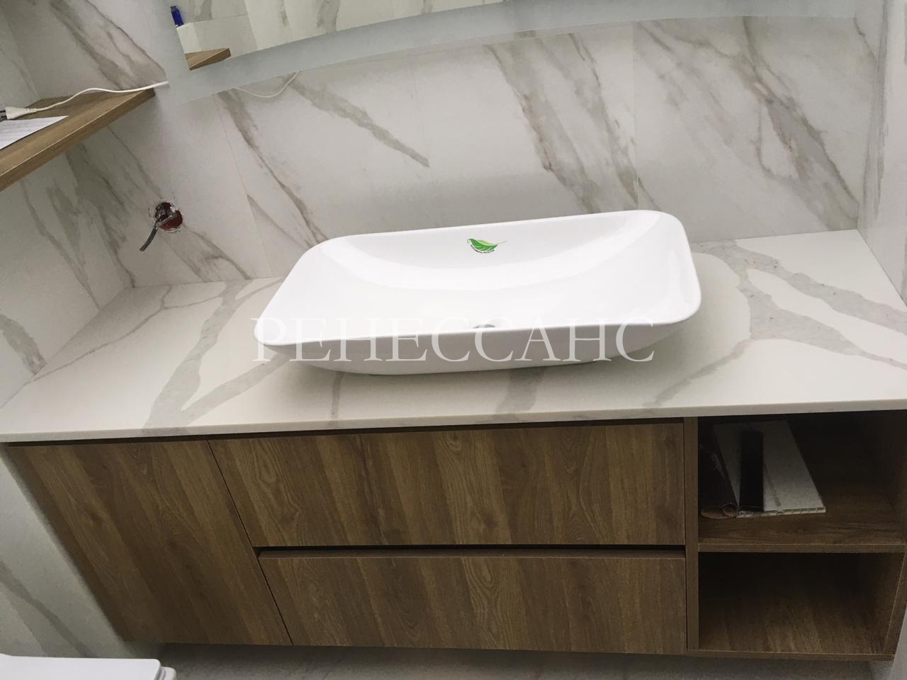 Подвесная тумба для ванной комнаты в древесном декоре с белой столешницей. Конструкция включает выдвижные ящики с системой скрытого открывания и открытые боковые ниши для хранения. На столешнице размещена белая накладная раковина. Декор под натуральное дерево создает теплую атмосферу в помещении.