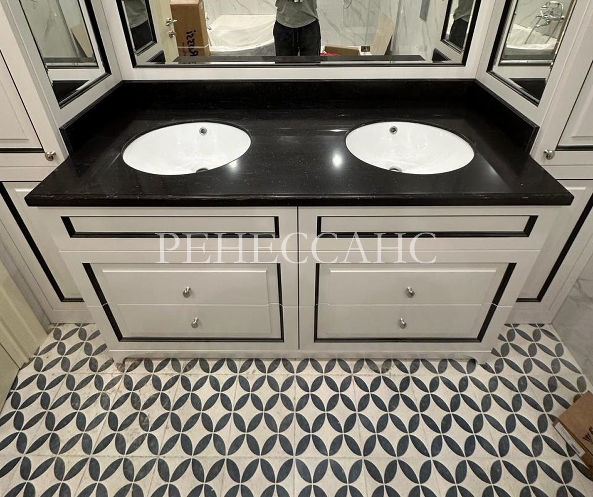 Просторная тумба с двойной раковиной для семейной ванной комнаты. Белоснежные фасады с фрезеровкой и черным кантом создают графичный образ. Серебристые декоративные ручки дополняют классический дизайн.