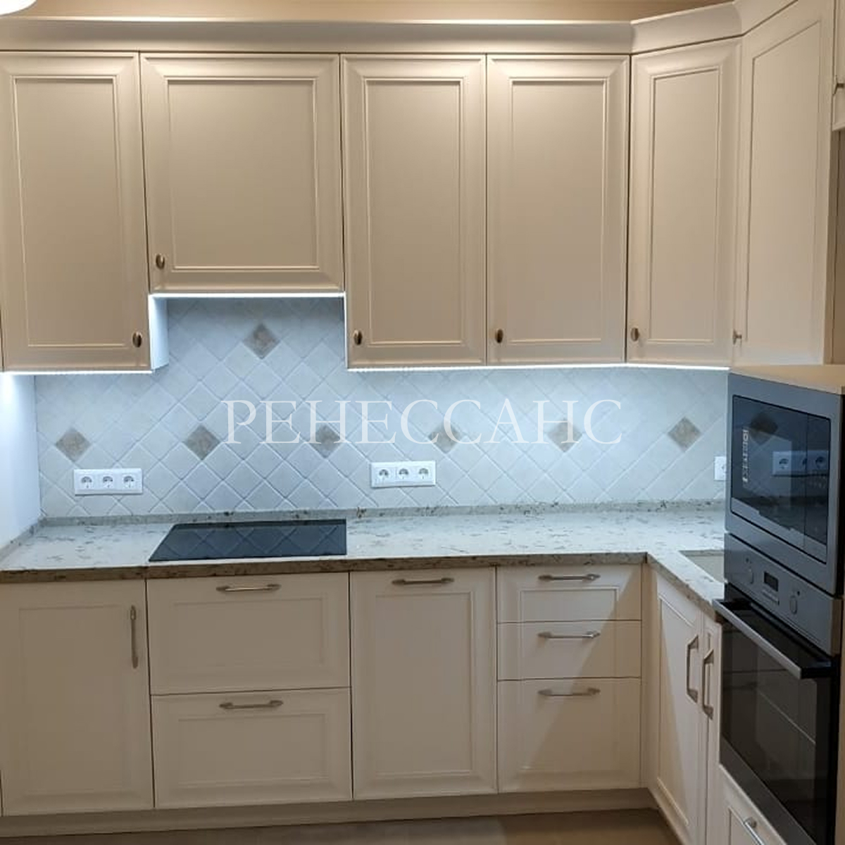 Угловая кухня в классическом стиле со светло-бежевыми фасадами с рамочной фрезеровкой и столешницей под светлый мрамор. Верхние навесные шкафы выполнены с классической фрезеровкой, хромированными ручками-кнопками и встроенной светодиодной подсветкой рабочей зоны. Нижние модули оснащены выдвижными ящиками и распашными дверцами с хромированными ручками. Столешница изготовлена из материала под светлый мрамор с серо-бежевыми прожилками и оснащена встроенной варочной панелью. Гарнитур предусматривает интеграцию встраиваемой техники. Светло-бежевый цвет с классической фрезеровкой в сочетании с элегантной столешницей и функциональной подсветкой создает уютное и традиционное кухонное пространство.