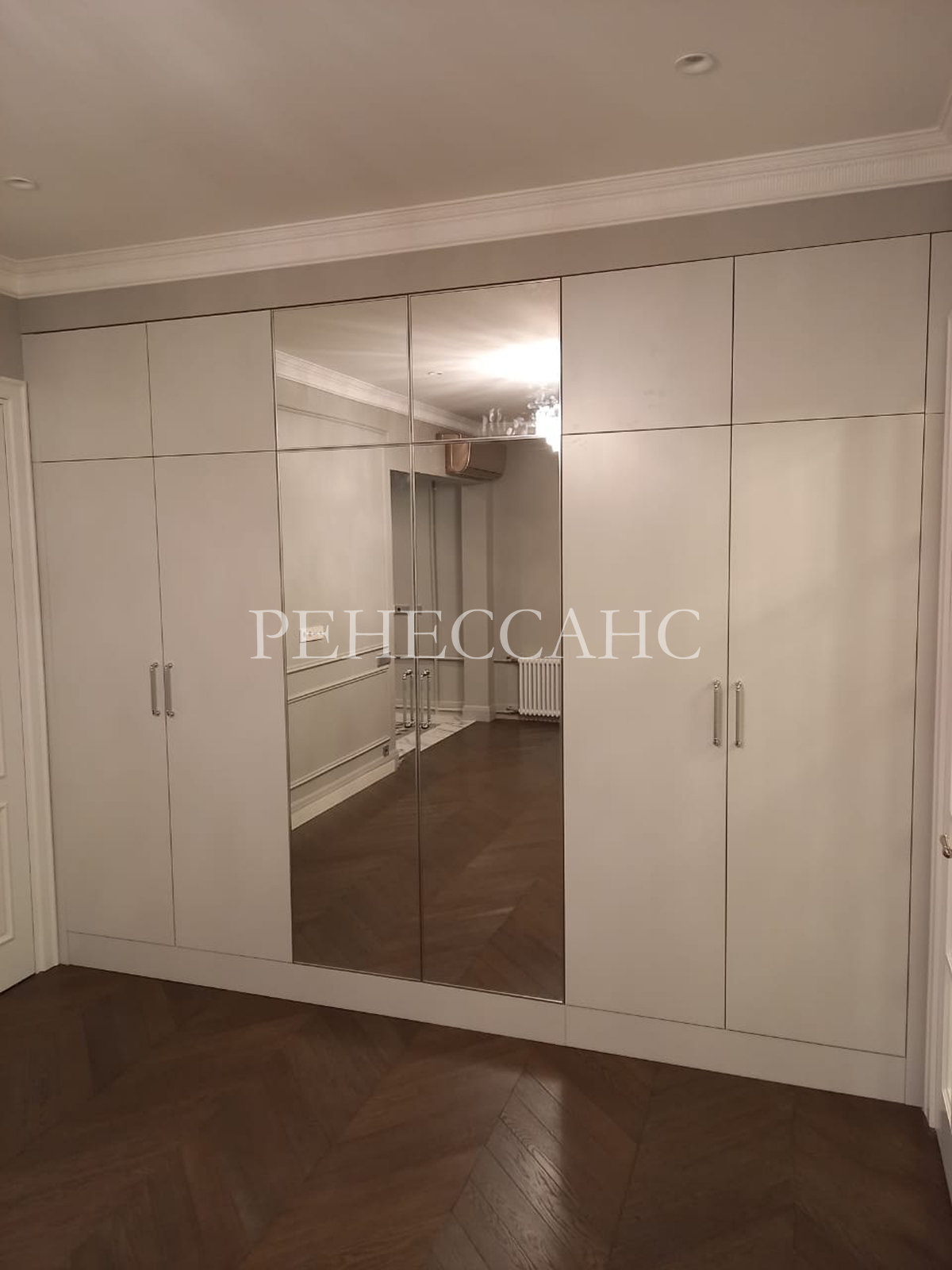 Встроенный шкаф-купе белого цвета, занимающий всю стену спальни от пола до потолка с интегрированными антресолями. Конструкция включает восемь распашных дверец с хромированными ручками и две центральные раздвижные зеркальные дверцы, которые визуально увеличивают пространство помещения. Верхняя антресольная зона предназначена для сезонного хранения. Распашные модули обеспечивают доступ к основным зонам хранения. Центральная часть с зеркальными дверцами служит удобным местом для примерки одежды. Белый цвет фасадов гармонично интегрируется в светлый интерьер спальни. Конструкция от пола до потолка максимально использует высоту помещения, обеспечивая значительный объем хранения. Сочетание распашных дверец и раздвижной системы создает гибкое и функциональное решение для спальни.