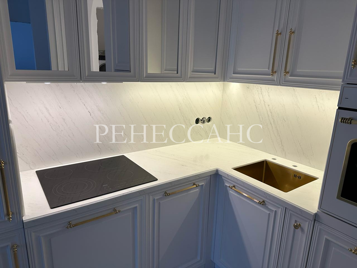 Угловая кухня в классическом стиле со светло-голубыми фасадами с классической фрезеровкой и столешницей под белый мрамор. Верхние навесные шкафы выполнены с рамочной фрезеровкой, включают модули со стеклянными вставками для витринного хранения и золотистыми классическими ручками. Нижние модули оснащены выдвижными ящиками и распашными дверцами с той же фрезеровкой и золотистыми ручками. Столешница из материала под белый мрамор с серыми прожилками включает интегрированную прямоугольную мойку золотистого цвета и встроенную варочную панель. Конструкция предусматривает интеграцию встраиваемой техники. Нежное сочетание светло-голубого цвета с золотистой фурнитурой и мраморной столешницей создает изысканное классическое кухонное пространство.